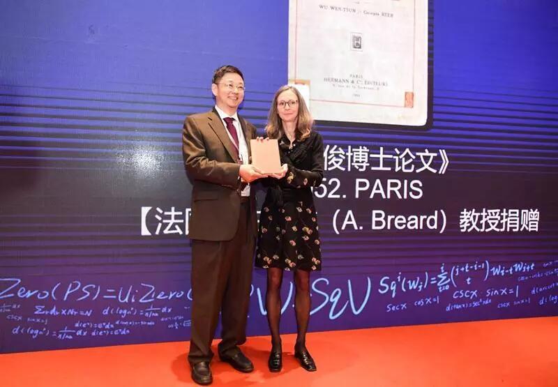 吴文俊与学生在一起开幕式上,法国巴黎第十一大学、奥赛科学学院教授白安雅,特地向吴文俊数学中心捐赠了她珍藏的吴文俊博士论文。数学科学学院院长李从明接受这份研究吴文俊数学思想的重要文献,并将其永远珍藏于吴文俊数学中心。
