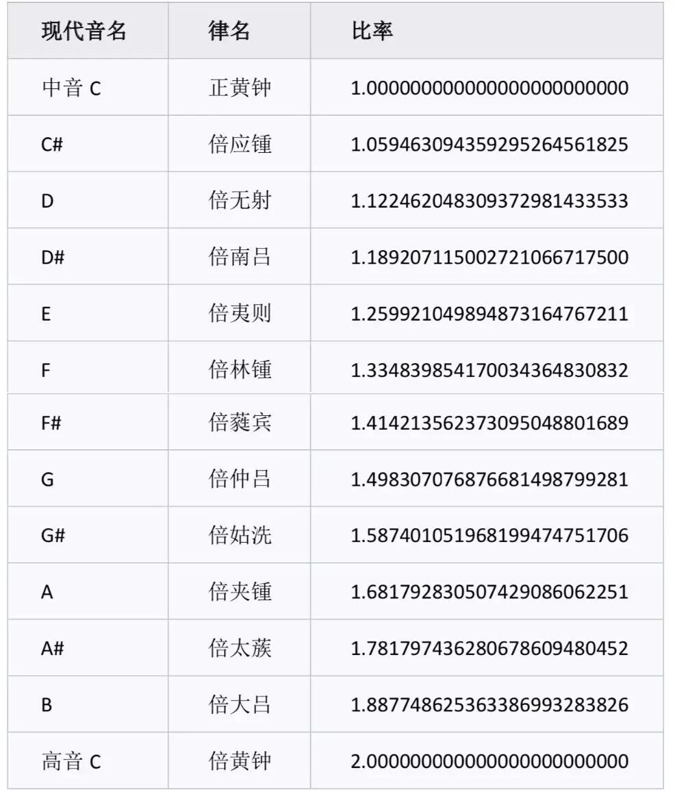 朱载堉认为:要让音乐和谐动听,必须保证所有相邻的音阶音高相差相同,也就是频率之比相同。一个八度内频率相差两倍,如果将其分成 12 份,每一份应该相差 2 的十二次方根。为此,朱载堉利用一个八十一位的超大算盘,计算了这个值,并精确到小数点后第二十五位。