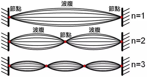 具体来分析:一根长度为 L 的弦,在振动过程中会形成振动剧烈的部分——波腹,和不振动的部分——波节。一根弦可以形成多种振动形式,实际的振动形式是这些振动的叠加。不过,只有一个波腹的振动是最主要的,多数能量都集中在这个振动形式,我们称之为基频。其他的波能量较弱,称之为泛音。由于泛音比例的不同,乐器的音色就会不同。对于基频波,弦长只有波长的一半,所以波长λ=2L。