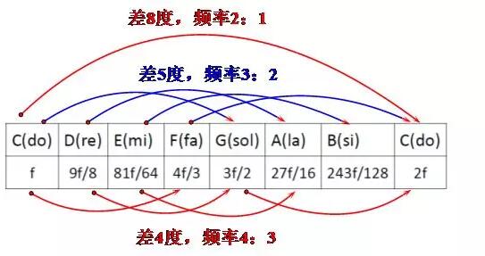 2. do 和 sol 之间相差 5 度,如果 do 的频率是 f,则 sol 的频率是 3f/2,re 和 la、mi 和 si、fa 和高音 do 也是一样。