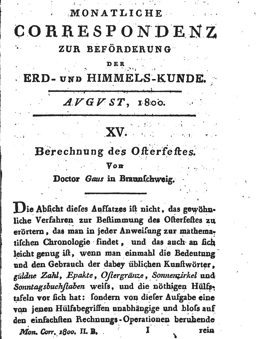 [注:题图是 Gauss 发表于杂志 Monatliche Correspondenz zur Beförderung der Erd-und Himmelskunde 第二期 (1800 年) 上关于复活节的计算的文章。这一工作的主体应当完成于 1800 年 5 月。]